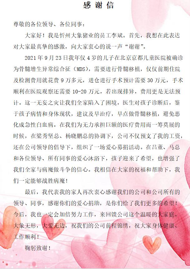 让爱心汇成海洋,让真情放飞希望。山西星空网官方站入口_星空(中国),农牧股份有限公司始终坚持以人为本,实施“人性化”管理,关心员工生活,注重企业文化建设,努力让员工通过奋斗过上幸福安稳的日子。病魔无情,人间有爱。公司作为实现梦想的事业平台,是每位员工的大家庭,让我们凝心聚力、团结奋进,共同将企业做大做强。