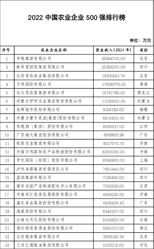 据悉,《2022中国农业企业500强》名单全面、客观、系统展现了我国农业企业发展情况,是较为权威的官方排名。活动参照国际通行评价办法,由企业按照要求进行申报或采用公开数据,参考利润和企业信誉等数据,经信息汇集、严格审核、专家评议等程序,依据2021年农业企业营业收入排序产生。